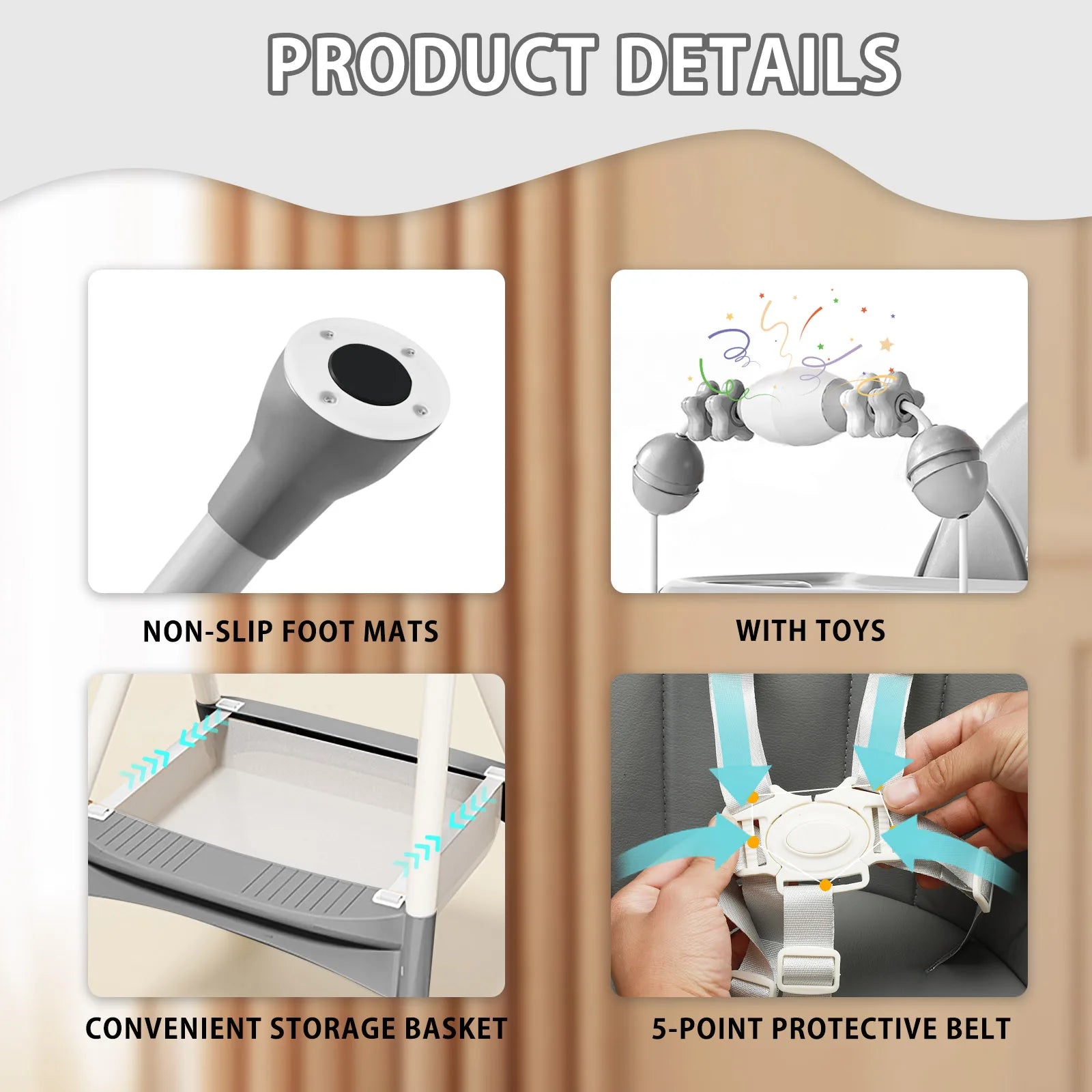 - A built-in toy rack keeps toys within reach, while an adjustable foot plate supports your child’s posture from 6 months to 3 years.