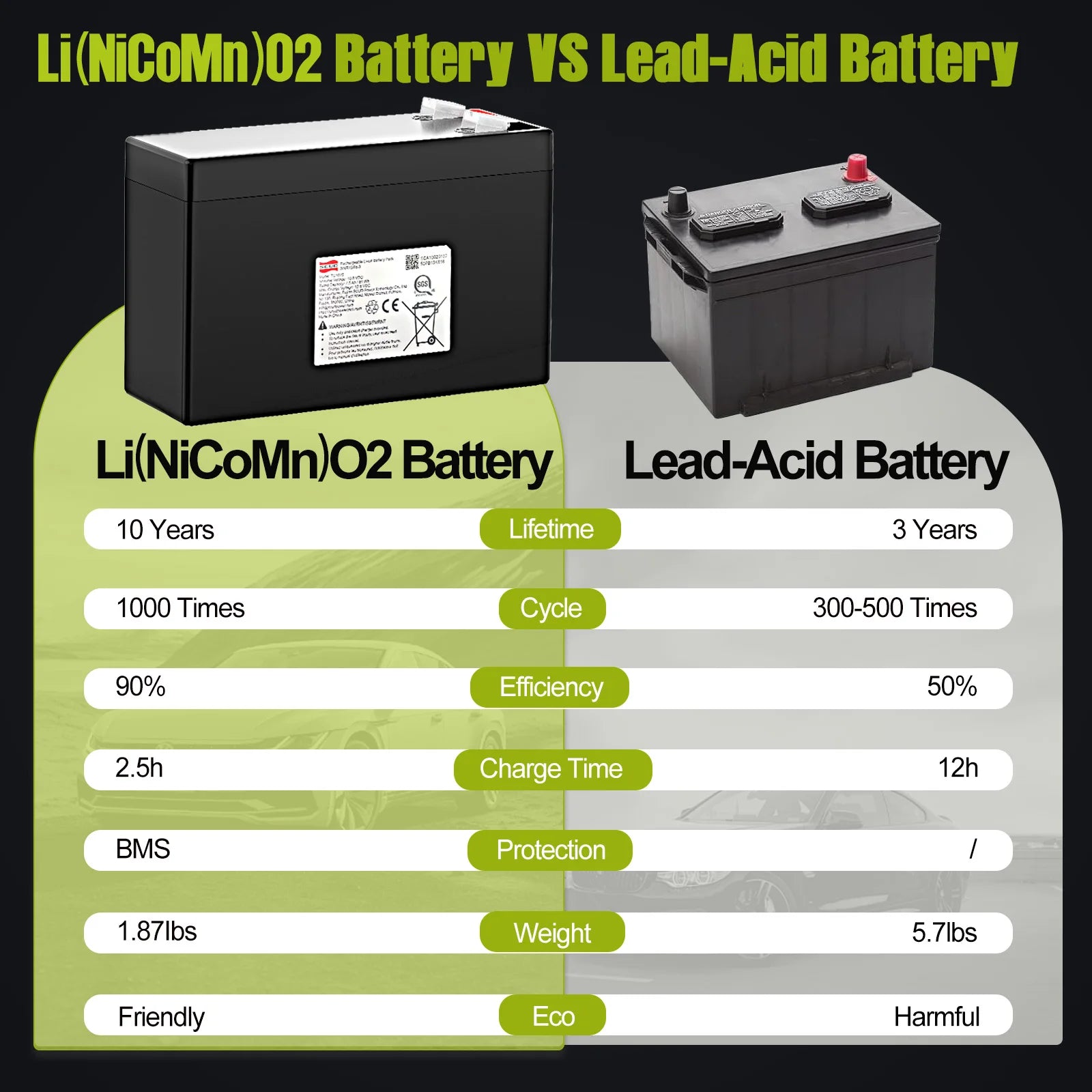 - Long life with ethical advantages: 1000+ deep cycles and roughly 80% capacity retention, reduced cobalt usage for a greener footprint, plus easier end-of-life recycling; note: charger not included—use Li(NiCoMn)O2-specific charger.