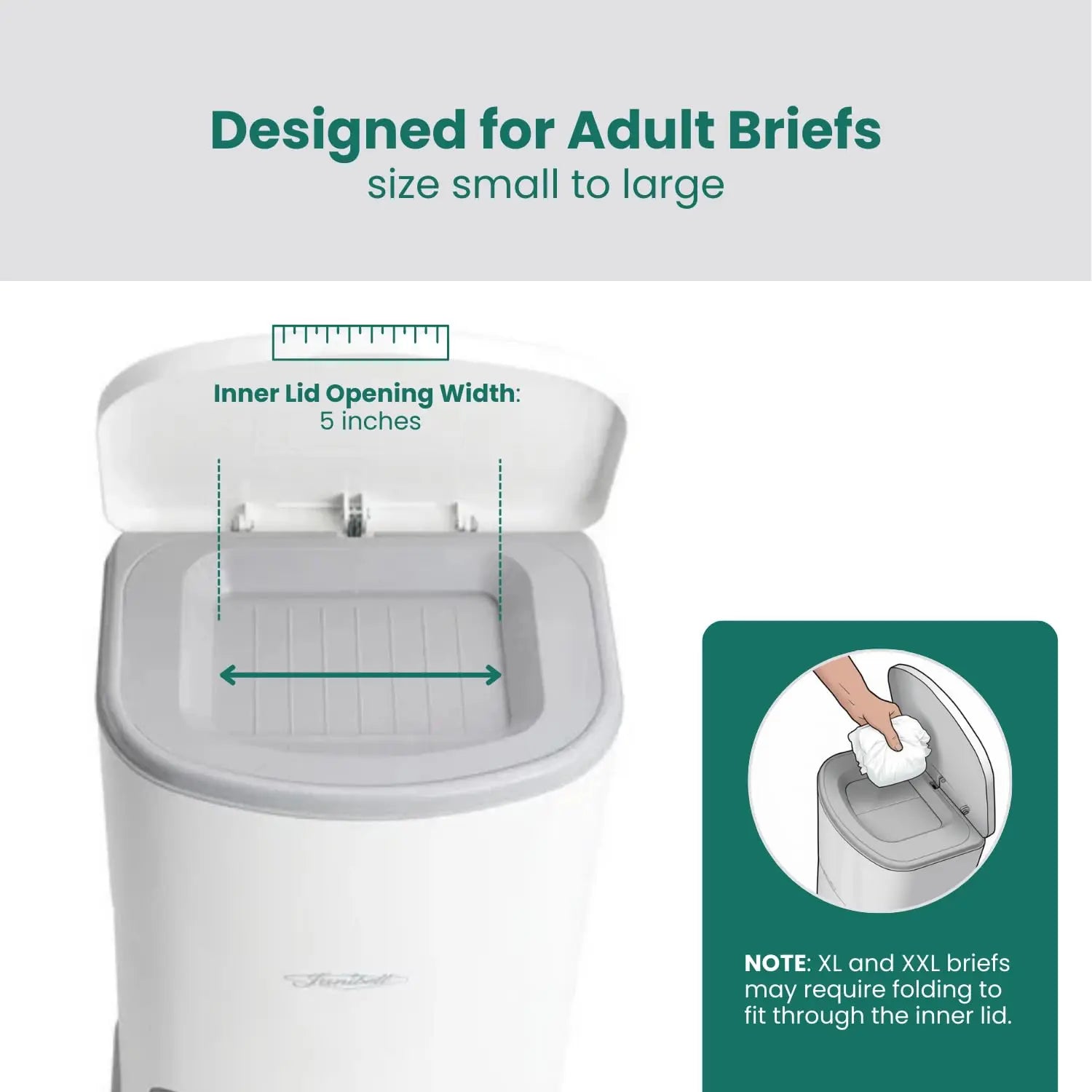 - Advanced odor-lock technology with a double-sealed trapdoor locks away smells from adult briefs, keeping your living space fresh and discreet.
